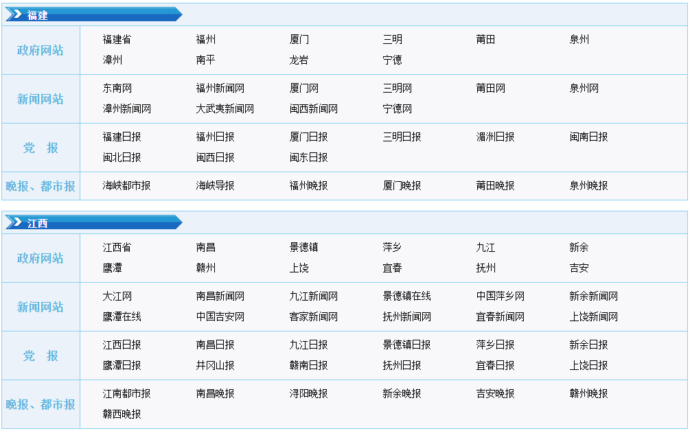 地方重點新聞平臺、政府網站、黨報、晚報一覽表