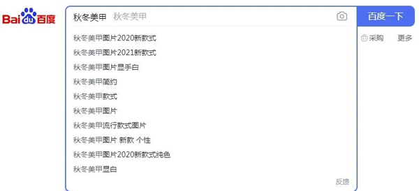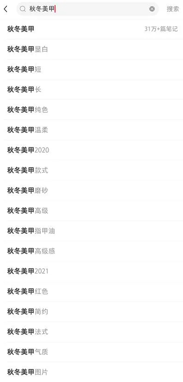 這種詞可以將文章內(nèi)容細化出來,能夠縮小選題范圍,與只做“秋冬美甲2021”關(guān)鍵詞相比,競爭會少很多,也會更容易找到精準用戶。