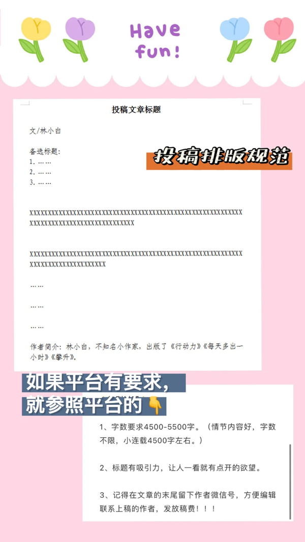 例如:標題三號字、正文四號字、在標題下面寫上筆名、幾個備選標題、還可以有作者簡介(如果投稿簡介里有格式具體要求,要以它們的為準)。