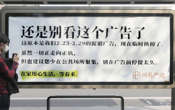 例如網易嚴選2020年初的一組戶外廣告,剛好處在疫情比較嚴重的時間點上,網易嚴選將原本的促銷廣告替換為公益溫馨提示:勸大家別看廣告,不要在這里停留太久,以免聚眾傳染。