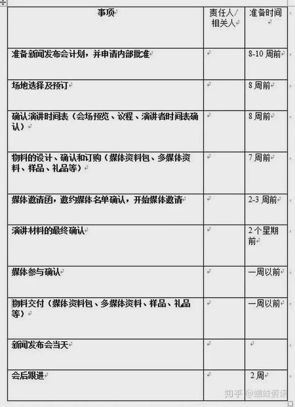 下表是涉及新聞發布會的主要事項,以及建議準備時長,當然,具體到不同的發布會,也會有其他的事項需要添加進來。