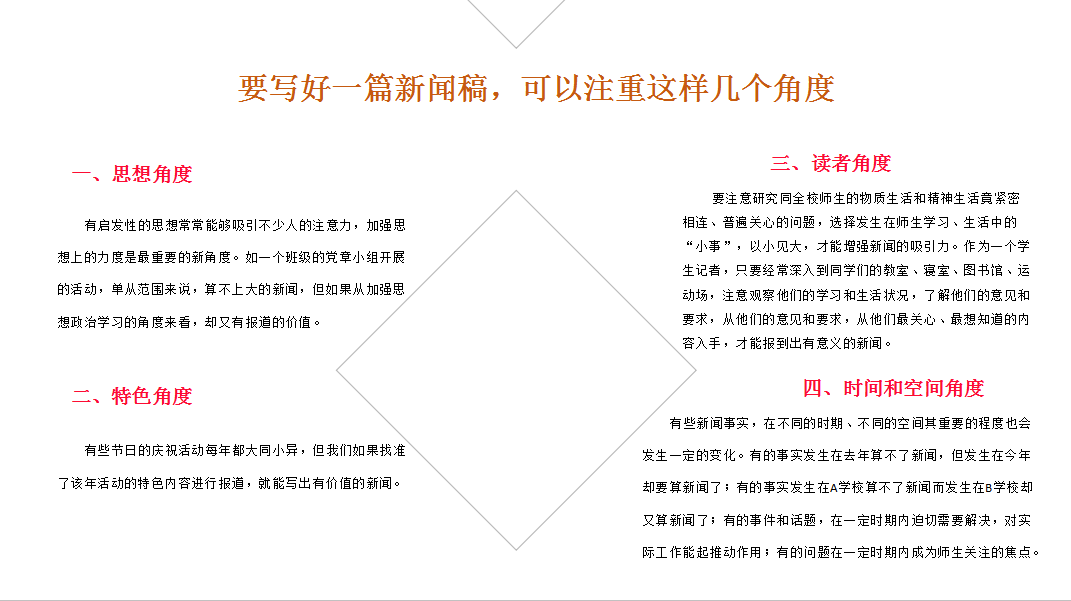 理解和掌握新聞寫作的基本方法——用事實說話。“用事實說話”是新聞的獨特魅力所在,也是一篇新聞的價值所在。不熟悉新聞寫作的人常常用自己的主觀評價和臆斷代替新聞事實,結果導致寫出來的新聞空洞無物,缺少新聞主題。主題是整篇新聞的靈魂,統領全篇。事實上,我們寫任何東西,都要有一個明確的目的,我們想要準確地傳達什么、宣傳什么,要做到心中有數,避免信筆涂鴉,不知所云。