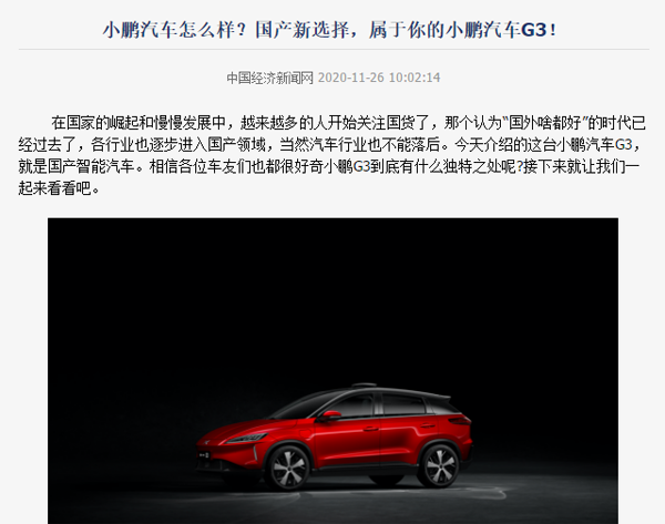 新聞軟文時軟文營銷的一種形式,是以新聞形式表現的營銷,新聞軟文時一種軟文廣告,軟廣告由于在形式上的隱蔽性和表達上的懸念性、完整性與可看性,抓住了消費者的心理,為企業的宣傳起到了積極的作用,如下圖小鵬汽車的新聞: