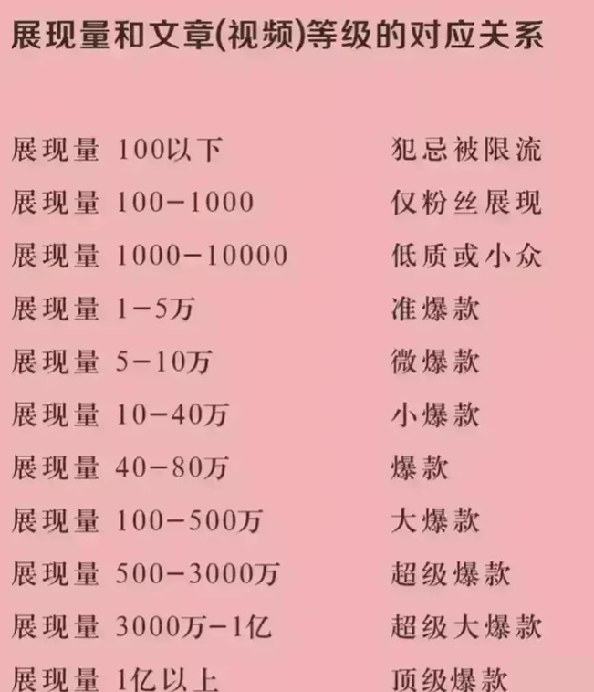 關于展現量和爆款等級,有一張圖廣為流傳。我特意看了今日頭條培訓小課程,兩者還是有很大區別。