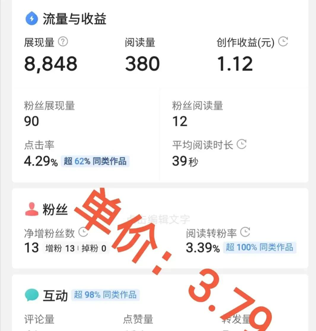 另外,閱讀千次單價差異很大,以微頭條為例。前幾天我的兩篇微頭條,一篇千次閱讀單價0.35,一篇閱讀千次單價3.79,整整差了十倍。