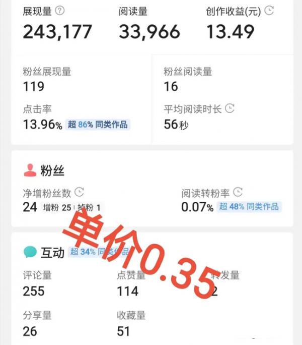 單價0.35元這條,閱讀量和展現量都非常不錯,點擊率13.96%。已小爆款三天,還在繼續爆。而單價3.79這條,閱讀量和點擊率都不占優勢,但是單價很高,趕上文章和視頻的單價了。