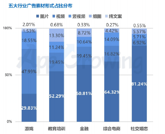 4、各行業均以巨量引擎和騰訊廣告為主要投放渠道;其他行業采用圖片素材最多,游戲行業則多以視頻素材為主,占整體素材近48%;素材文案使用“開局”、“爆率”、“裝備”、“無限金幣”等詞匯較多。