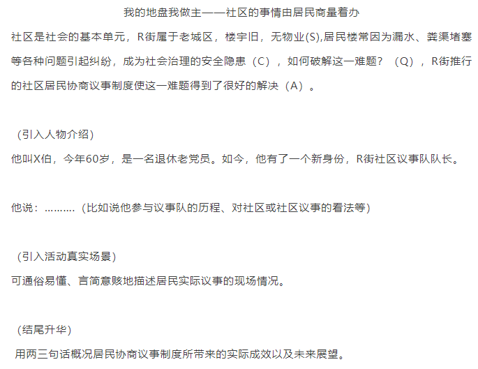 (4)定內容:通俗易懂,簡單明了,短小精悍。根據立場、對象以及在大量的素材中選出重要切入點進行內容闡述即可。切入點要小,落腳點要大。