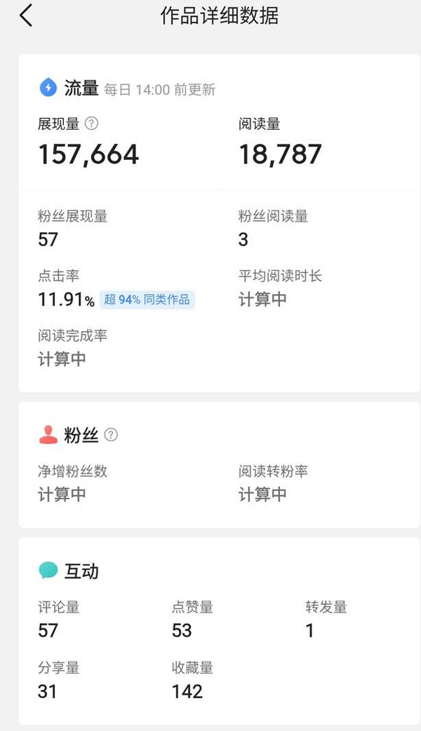 本人昨天寫了篇文章,展現量和閱讀量都不錯,這篇文章展現量有15.7萬,閱讀量有18787,一篇文章吸了42個粉絲,是我這段時間寫的文章里,表現最好的一篇,個人覺得還是很有成就感的,我才這個月開始寫文章哦。
