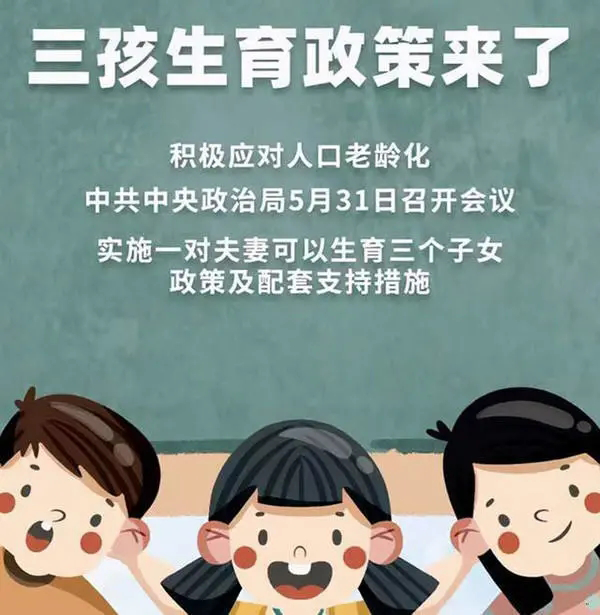 三孩政策,是中國積極應對人口老齡化而實行的一種計劃生育政策。2021年5月31日,中共中央政治局召開會議,審議《關于優化生育政策促進人口長期均衡發展的決定》并指出,為進一步優化生育政策,實施一對夫妻可以生育三個子女政策及配套支持措施。