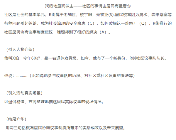 (4)定內容:通俗易懂,簡單明了,短小精悍。根據立場、對象以及在大量的素材中選出重要切入點進行內容闡述即可。切入點要小,落腳點要大。