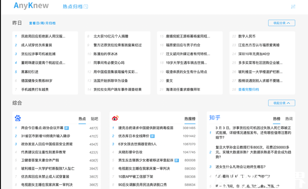 這個(gè)聚合的平臺(tái)數(shù)量相對很少,基本是國內(nèi)的一些主流媒體平臺(tái),不過它有個(gè)不錯(cuò)的特點(diǎn),就是可以查看日/周/月的熱點(diǎn)歸檔,可以方便我們查看往期的熱點(diǎn)內(nèi)容。