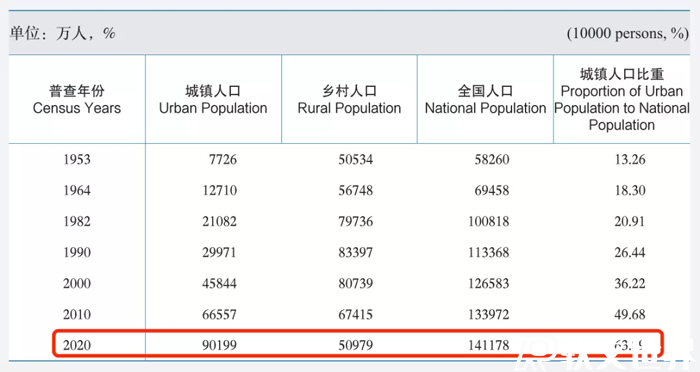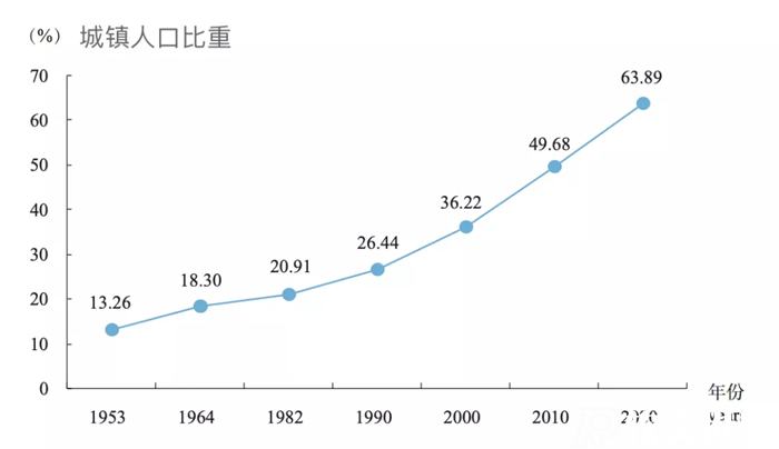 我從國家統(tǒng)計(jì)局找到了第七次人口普查的數(shù)據(jù),其中有一項(xiàng)是我國城鎮(zhèn)人口的占比,2020年達(dá)到了63.89%。
