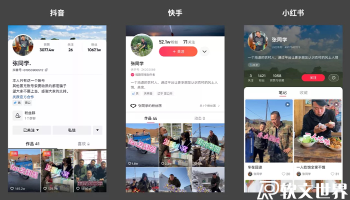 張同學(xué)的出圈和火爆是在抖音平臺(tái),但張同學(xué)并不只在抖音發(fā)布作品。他在快手和小紅書上同樣開設(shè)了賬號(hào)。