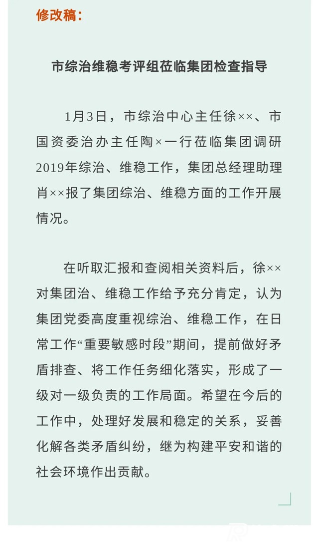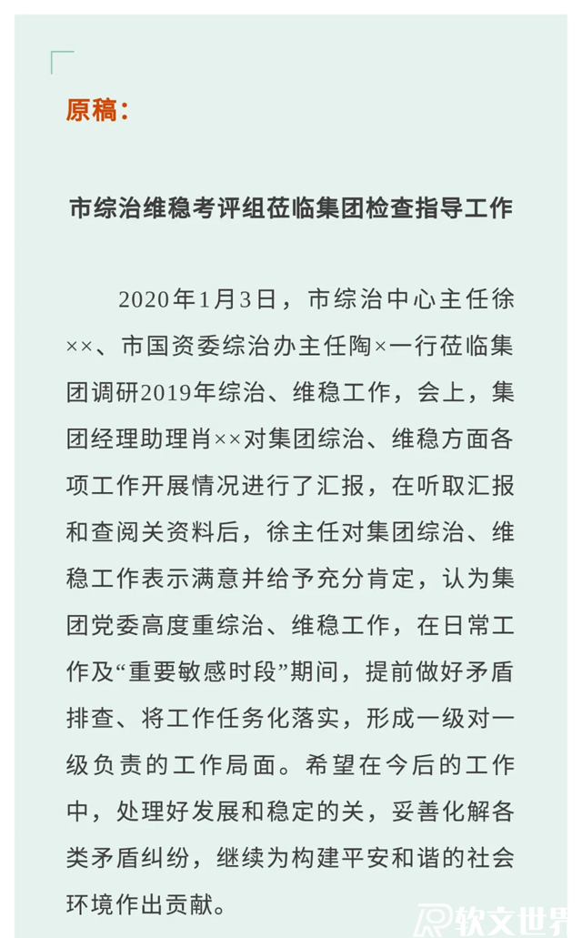 ruanwenshijie.com一是稿件領導很重視,并要求稿里一定要有故事,且要把故事講好、講生動。假如原稿里有故事,內容也不錯,但是講得不生動,不吸引人,這種情況下就需要修改稿件。二是要求稿件篇幅要短而精,當力求簡潔順暢。