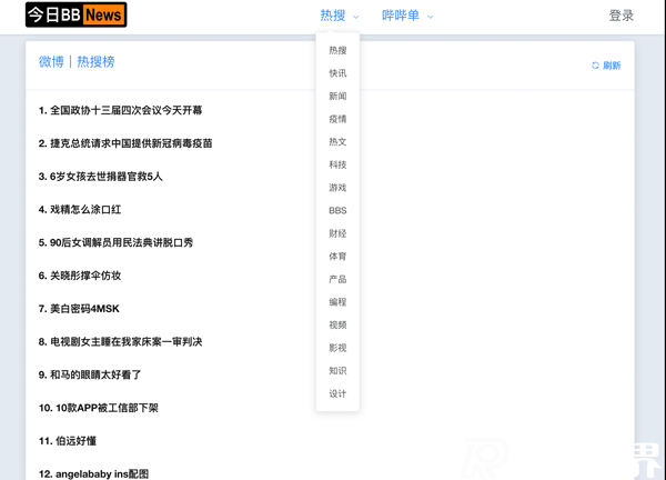 一個非常清爽簡約的熱點聚合網站,名字很好記,熱點內容會自動展示在首頁,你可以根據自己的興趣愛好查看熱搜的分類,它還有一個自己的話題榜單。