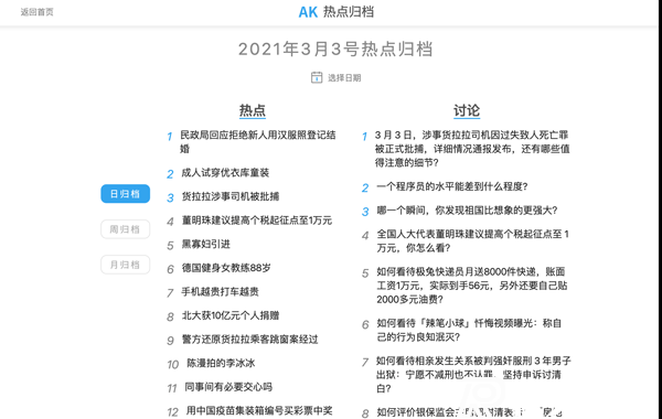 這個聚合的平臺數量相對很少,基本是國內的一些主流媒體平臺,不過它有個不錯的特點,就是可以查看日/周/月的熱點歸檔,可以方便我們查看往期的熱點內容。