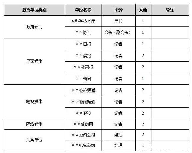 發布會將邀請政府部門、媒體和關系單位參加,預計來賓人數19人,如下表所示。
