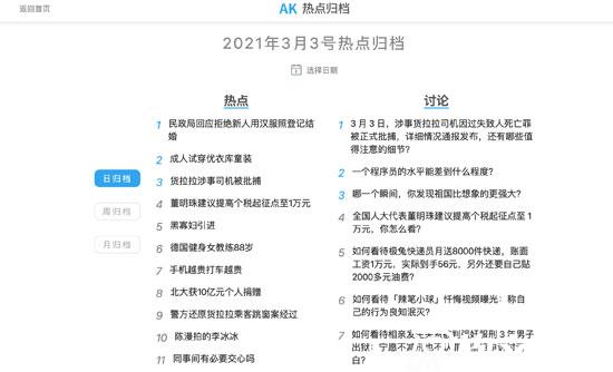 這個聚合的平臺數量相對很少,基本是國內的一些主流媒體平臺,不過它有個不錯的特點,就是可以查看日/周/月的熱點歸檔,可以方便我們查看往期的熱點內容。