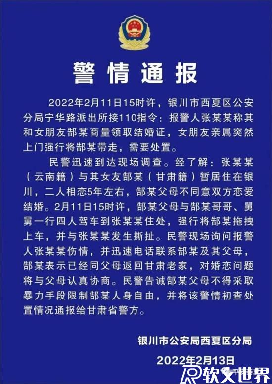 2 月 13 日,銀川市公安局西夏區(qū)分局發(fā)布警情通報(bào)。通報(bào)稱(chēng),事發(fā)當(dāng)日,女孩郜某的父母與郜某哥哥、舅舅一行四人駕車(chē)至男孩張某某住處,強(qiáng)行將郜某拖拽上車(chē),并與張某某發(fā)生撕扯。民警了解后得知郜某表示已經(jīng)同父母返回甘肅老家,對(duì)婚戀問(wèn)題將與父母認(rèn)真協(xié)商。民警告誡郜某父母不得采取暴力手段限制郜某人身自由,并將該警情初查處置情況通報(bào)給甘肅省警方。
