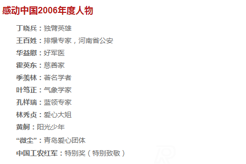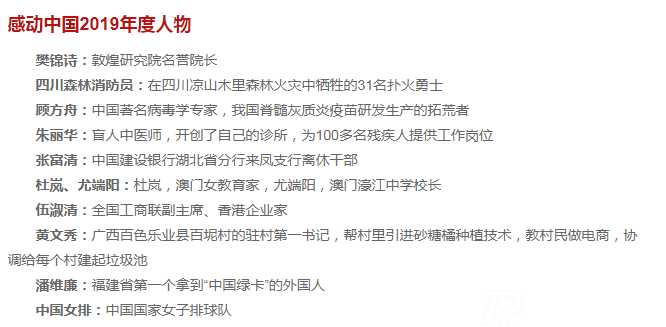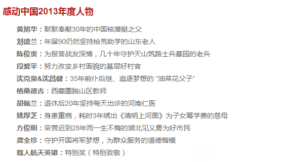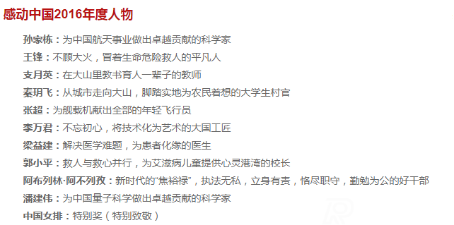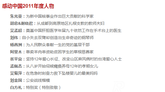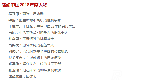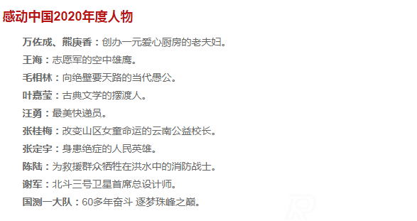 2021感動中國年度人物名單人物為:彭士祿、楊振寧、顧誦芬、吳天一、朱彥夫、中國航天人、蘇炳添、陳貝兒、張順東李國秀夫婦、江夢南。