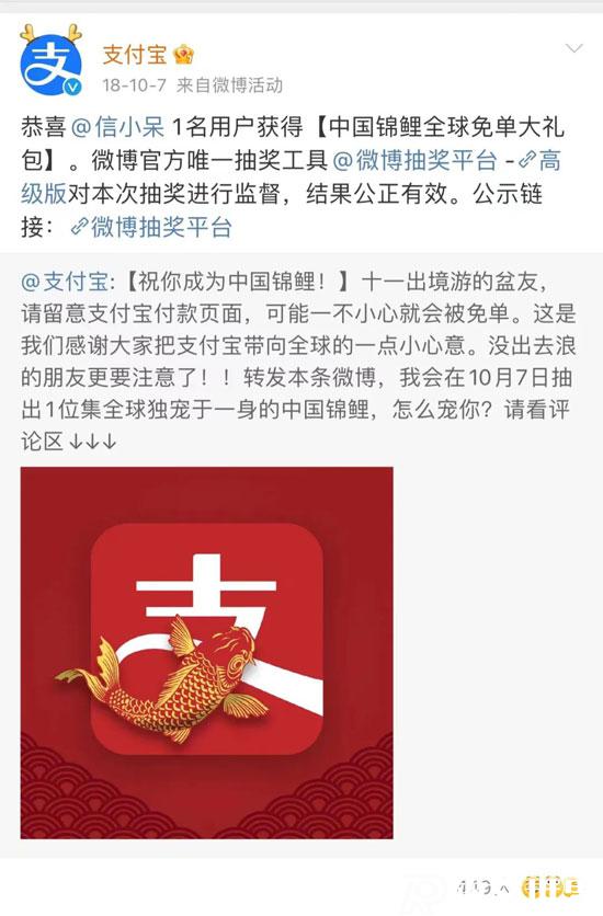 支付寶官微發了一條尋找中國錦鯉的微博,稱在十一黃金周,將隨機抽取出境游的用戶免單,并在10月7日抽取轉發這條微博的一名粉絲為“中國錦鯉”,送上來自各大品牌的大禮包。