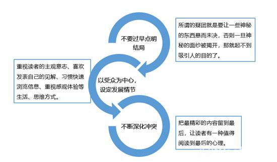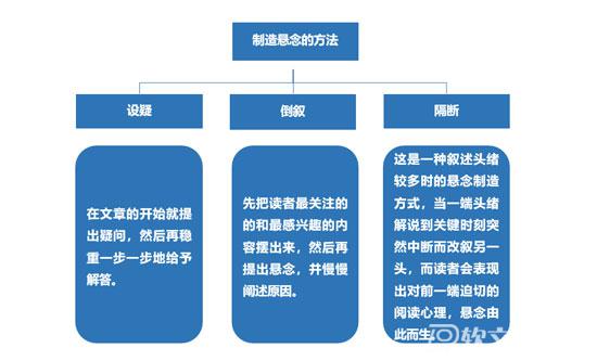 也就是說,懸念式軟文就是將懸念設置好,然后嵌入到情節發展中去,讓讀者自己去猜測、去關注,等到吸引了受眾的注意后,再將答案公布出來,制造懸念通常有三種方法,如下圖: