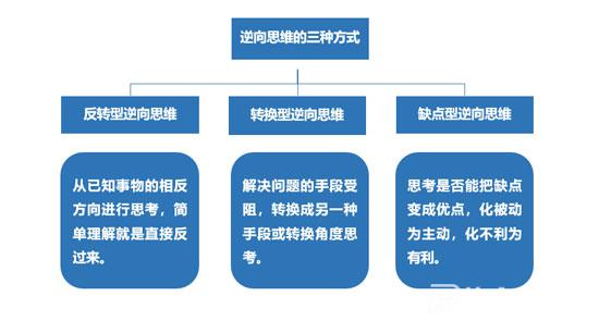 人們的慣性思維是按照事情的正常發展方向去尋找某一件事情的解決方法,但是,有時候換一種思考方向可能事情會更加容易解決。在編寫逆向思維式軟文時,有三種方式可以參考: