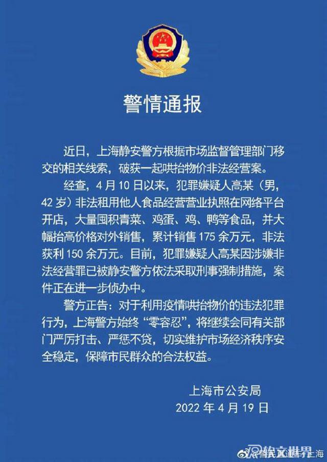 “借疫情發黑心財?”上海男子高某,在疫情期間,大量囤積青菜、雞蛋、雞、鴨等食品,大幅抬高價錢對外出售,累計銷售175余萬元,非法獲利150余萬元。目前,高某因涉嫌非法經營罪已被靜安警方依法采取刑事強制措施,案件正在進一步偵辦中。(來源:警民直通車上海)