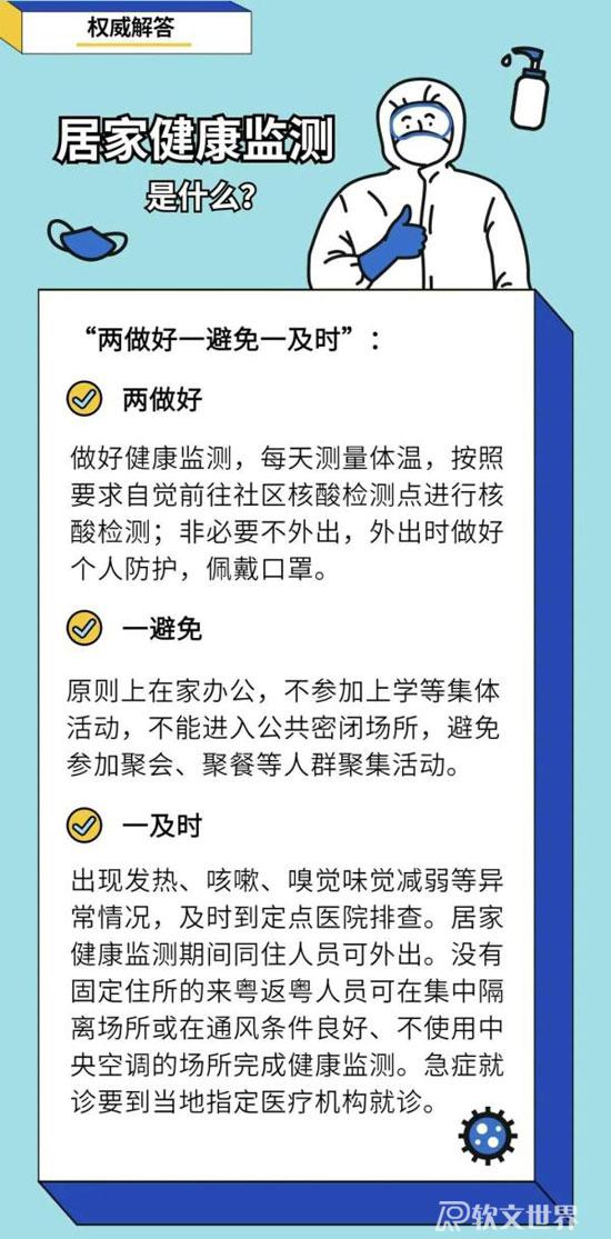 一及時:出現發熱、咳嗽、嗅覺味覺減弱等異常情況,及時到定點醫院排查。居家健康監測期間同住人員可外出。沒有固定住所的來粵返粵人員可在集中隔離場所或在通風條件良好、不使用中央空調的場所完成健康監測。急癥就診要到當地指定醫療機構就診。