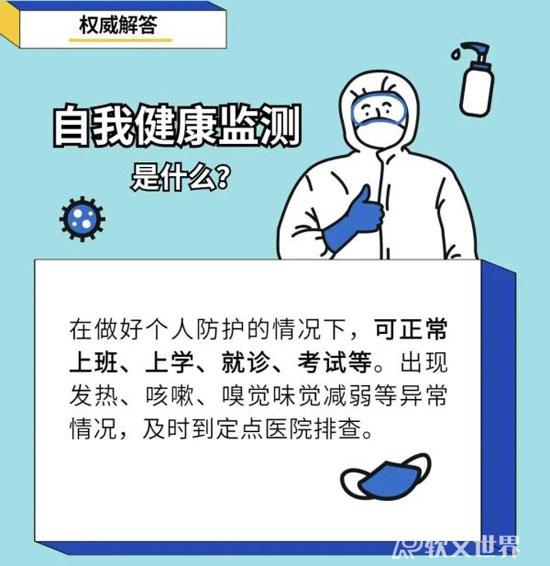 進行“自我健康監測”期間,在做好個人防護的情況下,可正常上班、上學、就診等。期間應每天注意自我健康狀況的觀察,如果出現發熱、咳嗽、嗅覺味覺減弱等異常情況,應及時到定點醫院排查。
