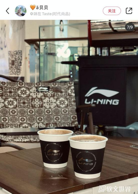 透過一位小紅書博主的打卡帖子,我們看到了寧咖啡的廬山真面目。今年2月初,她在廣東湛江市一家新開的李寧專賣店門口,看到了標(biāo)有“LI-NING”標(biāo)識(shí)的咖啡小推車,車篷上印有李寧品牌logo和“X CAFE”的字樣。帖子中她提到,在李寧門店任意消費(fèi)都可以免費(fèi)喝一杯李寧咖啡,杯子的logo也是常見的李寧品牌樣式,很有氛圍感。