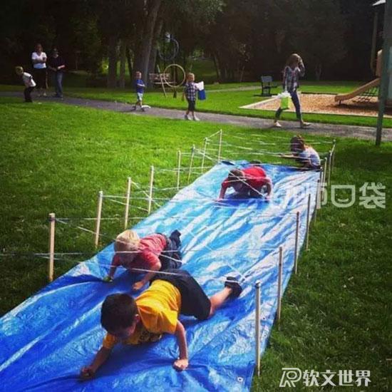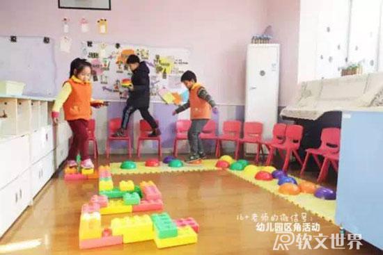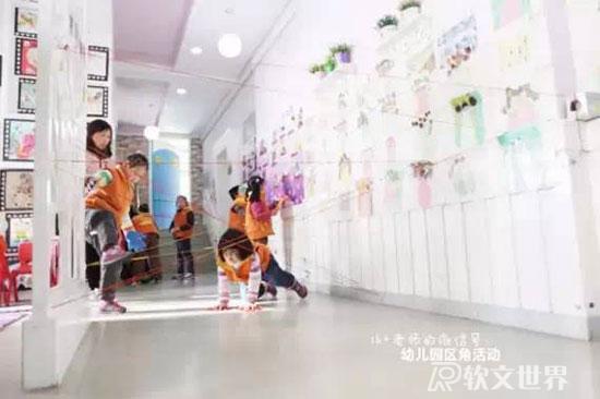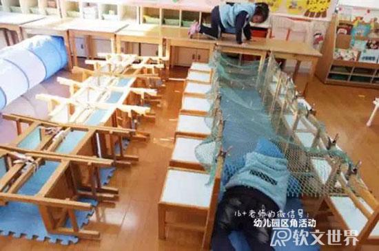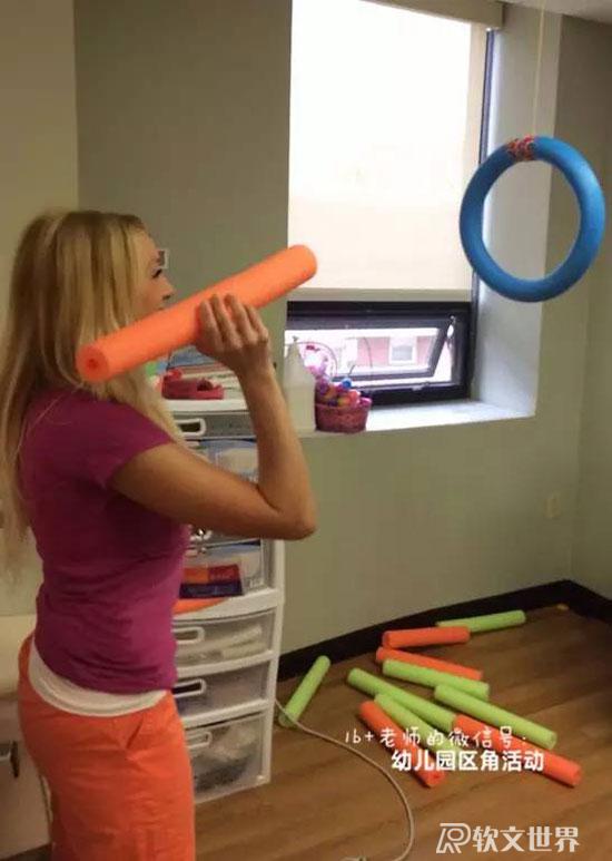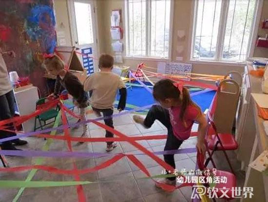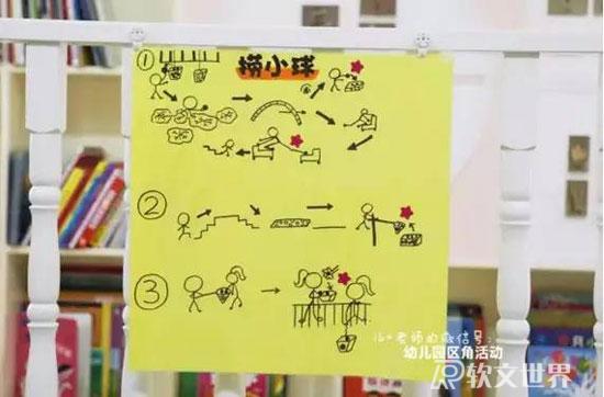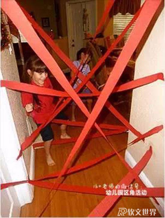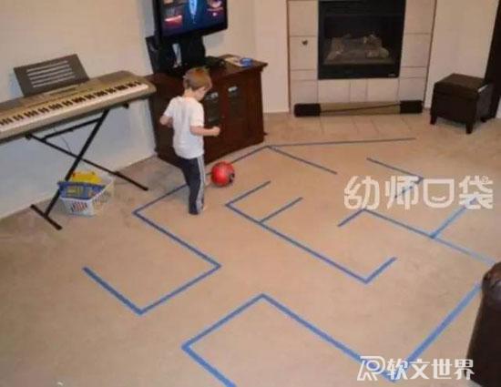 ruanwenshijie.com玩法:利用走廊公共閱覽區(qū)設計游戲,有樓梯、有彎道,加上簡單的圖片提示。幼兒能通過提示,記住路線,最后撈到小球。從起點過“河”,鉆過“山洞”,爬到“山頂”,走過“石子路”,到“山崖”邊去撈小球。