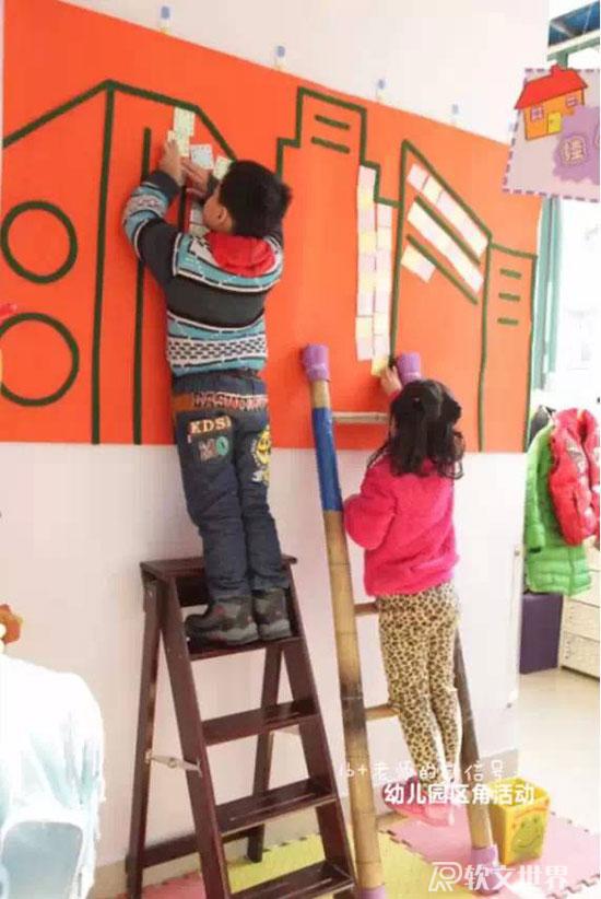 玩法:將教室拐角的墻面布置成“建筑物”,放幾把不同的梯子,幼兒拿好“墻磚”,爬上梯子,穩(wěn)穩(wěn)地站好,將“墻磚”貼到建筑物上。