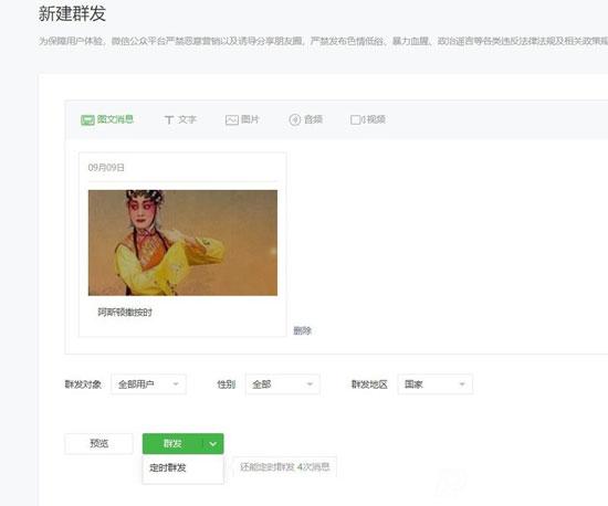 2.點擊“保存并發送”之后會跳轉到發送頁面,可以設置“發送對象”、“性別”、“發送地區”,這些條件設置好以后,點擊“發送”會將消息立即發送,選擇“定時發送”可以設定消息發送的時間。