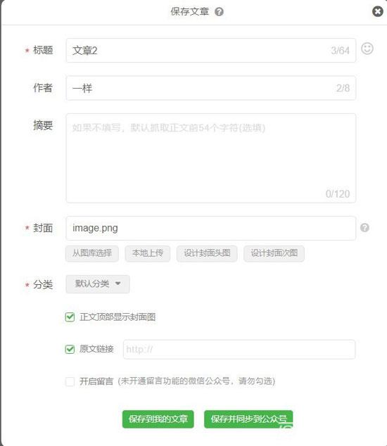 2.依次填入文章標題、作者、文章封面,如果是轉載的文章,需要在“原文鏈接”處填寫原文鏈接,開通過留言功能的公眾號可以勾選“開啟留言”。