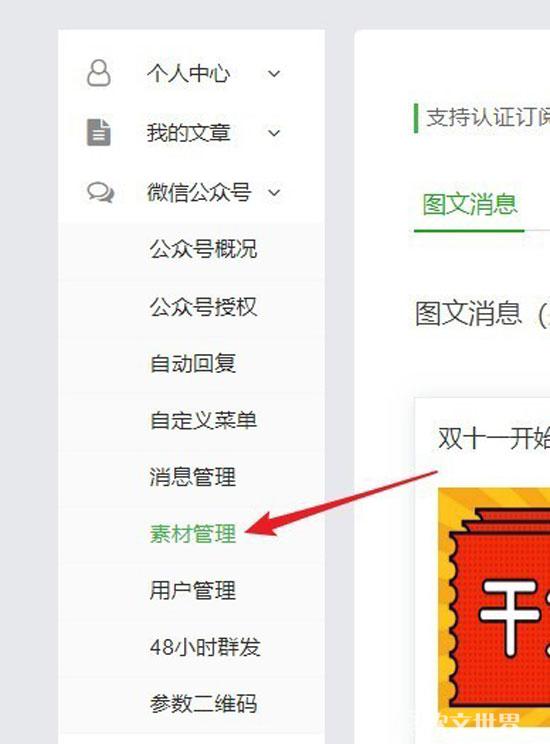 5.頁面跳轉以后,點擊“素材管理”,找到剛才同步的文章,按照微信公眾平臺發送文章的方法操作即可。
