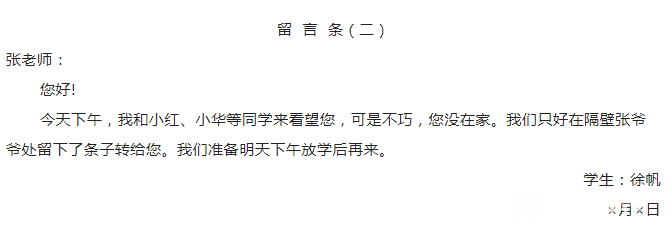 探望老師,老師不在家,給老師留言。禮貌、清楚,符合格式要求。