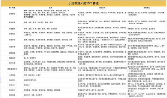 不同的品類下也有細分領域,如下圖小紅書爆火的15個賽道,產生不同的內容形式和不同變現方式。