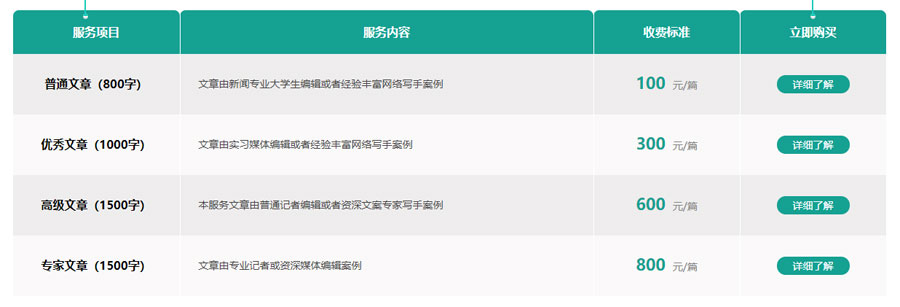 軟文代寫(xiě)的費(fèi)用,假如僅僅普通軟文,我們只需要依照100元一篇的價(jià)格做預(yù)算即可。還有便是軟文發(fā)布的費(fèi)用,這部分費(fèi)用差異很大,最便宜的幾塊錢(qián)的也有,上千元的也有,下面看看軟文世界的軟文發(fā)布渠道價(jià)格: