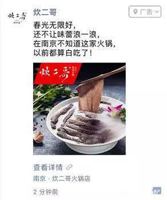“春光無限好,還不讓味蕾浪一浪”的趣味性語句,親切幽默,無形中增強了用戶與品牌互動的興趣;而精致的火鍋食材,強烈吸睛,更讓美食愛好者們忍不住點擊進去。
