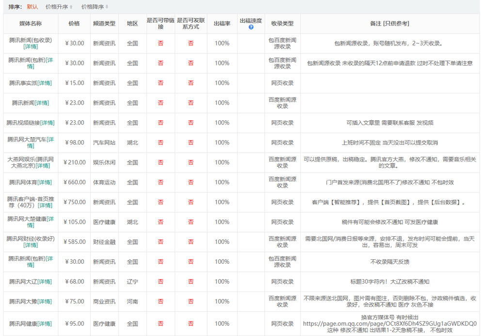 騰訊網發稿價格并不統一,每個頻道的價格都是不一樣,例如:騰訊事實派-15元、騰訊新聞事實派-30元、騰訊網新聞(包收錄)-30元、騰訊網大遼-68元、騰訊網大楚汽車-98元,更多請查看“軟文世界-媒體價格”。
