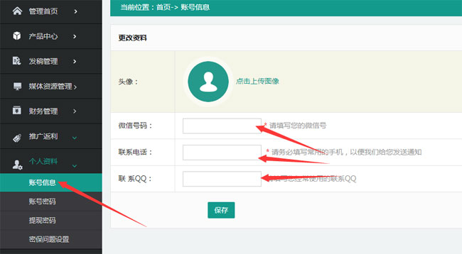 通過后臺(tái)個(gè)人資料中的“賬號(hào)信息”,填入微信號(hào)碼、聯(lián)系電話、聯(lián)系QQ(必填),填寫完后,即可進(jìn)行下一步操作。
