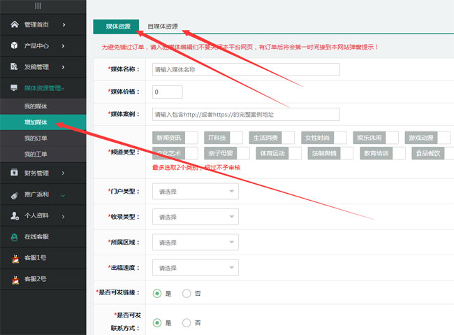 具體資料包括:媒體名稱、媒體價(jià)格、媒體案例、頻道類型、門戶類型、收錄類型、所屬區(qū)域、出稿速度、還有便是要勾選“是否可發(fā)鏈接”以及“是否可發(fā)聯(lián)系方式”,最后填寫媒體備注(如果是有收稿限制,記得填寫清楚,不懂可以參考其他媒體平臺(tái)備注),填寫完畢選擇“提交資料”即可。