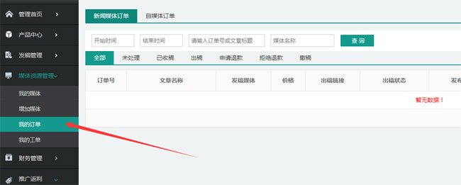 媒體成功上架后,通過后臺(tái)媒體資源管理中的“我的訂單”,查看收稿信息,收稿、出稿、售后都是通過“我的訂單”進(jìn)行操作。