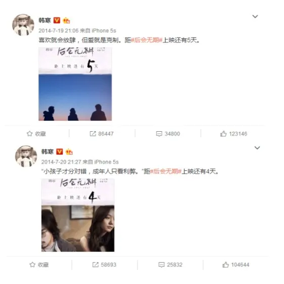 優秀的微博軟文最大的特點在于簡單且戳中人心。比如韓寒在《后會無期》上映之前的海報文案,句句都是精華,沒有任何廢話。這廣告打得格調高,十分適合網友轉發。