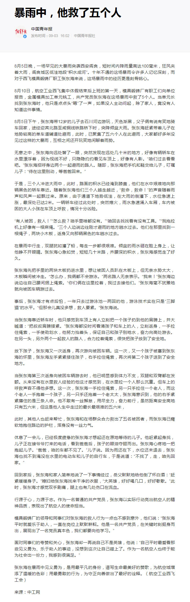 “暴雨中,他救起了5個(gè)人”,個(gè)人感覺這篇文章寫的特別美,美不僅是因?yàn)槭论E感人,還在于它的寫作技巧,藝術(shù)來源于生活,高于生活,文章借用真實(shí)事跡,巧妙利用細(xì)節(jié)刻畫、數(shù)據(jù)效果說話、矛盾沖突、氣氛渲染等手法給人以畫面感;用鋪墊、故事延伸給人以情節(jié)的完整感,最后通過引入第三人的視角,來升華主題,引人遐想。一百個(gè)讀者就有一百個(gè)哈姆雷特,請(qǐng)大家各自欣賞這篇文章,歡迎共享大家的所感所得。
