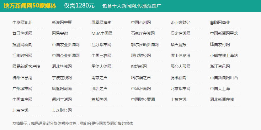 中央門戶網(wǎng)站+地方門戶網(wǎng)站+自媒體大號(hào),立體媒體組合方案實(shí)現(xiàn)企業(yè)品牌推廣、招商加盟、產(chǎn)品銷售,品效合一,低成本占領(lǐng)互聯(lián)網(wǎng)營(yíng)銷高地。