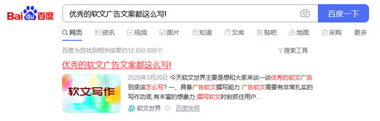 1、搜索新聞稿涉及的關鍵詞。不一定非要指定某一個關鍵詞,可以幾個關鍵詞組合著一起搜。我們在搜索的時候可以搜索“軟文怎么寫”、“軟文廣告怎么寫”、“軟文廣告文案怎么寫”等詞,多變換組合幾次關鍵詞可以增加檢測的準確度。(如下圖)